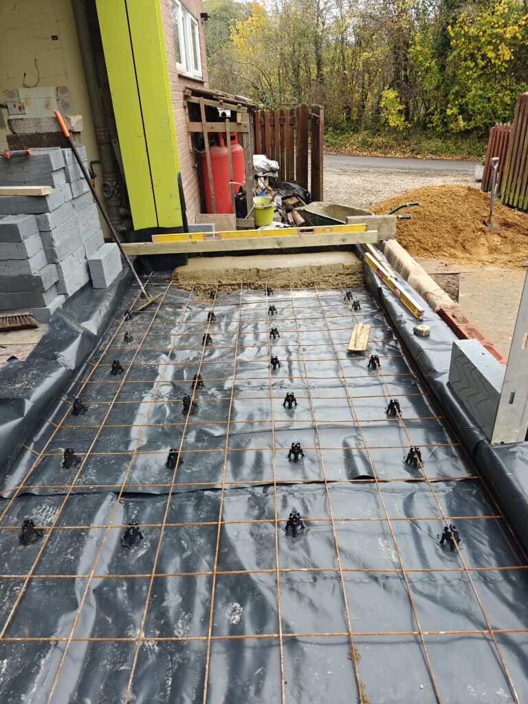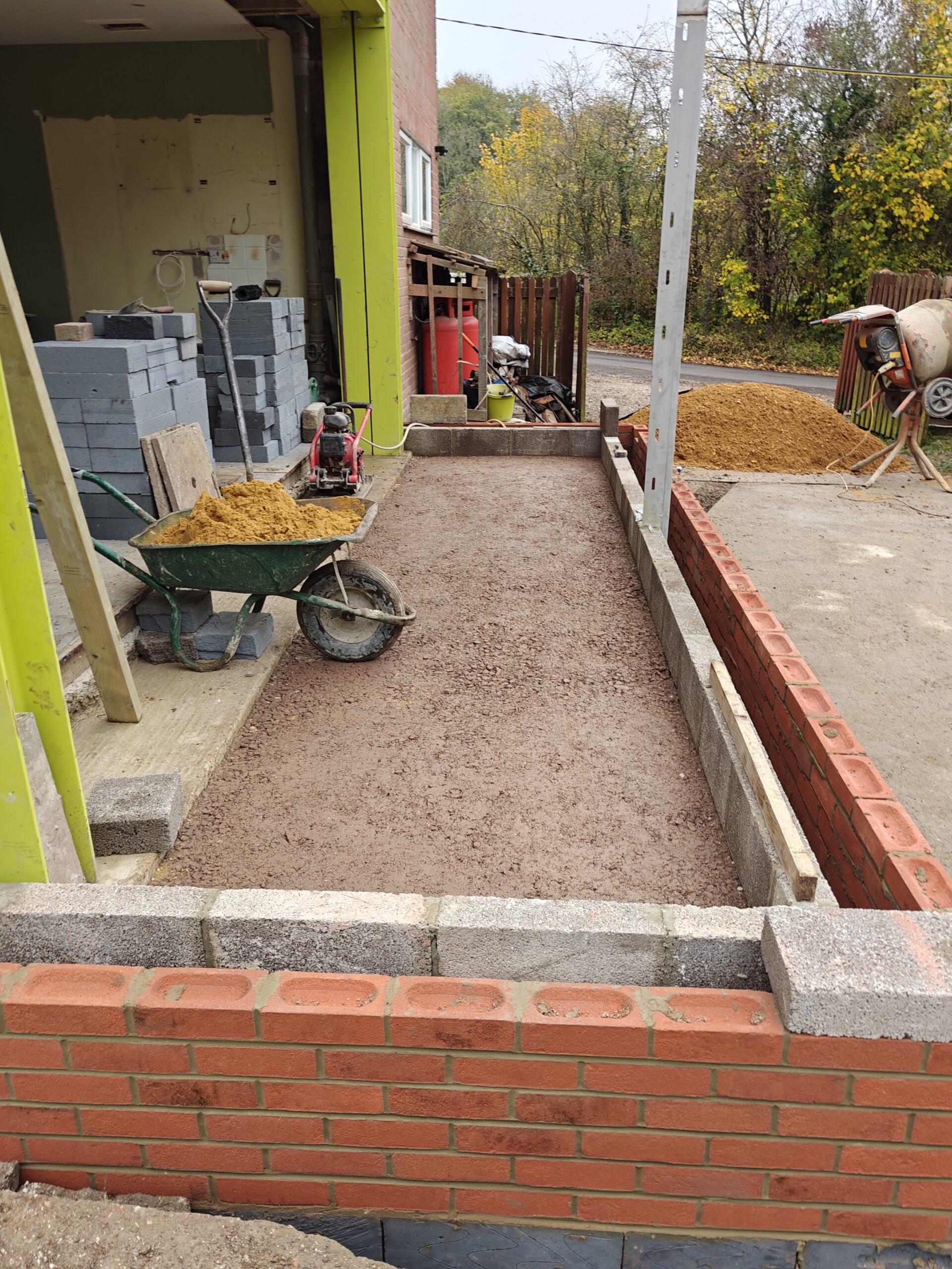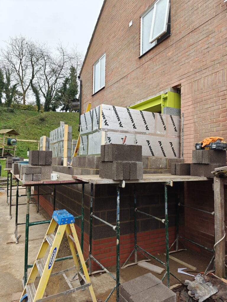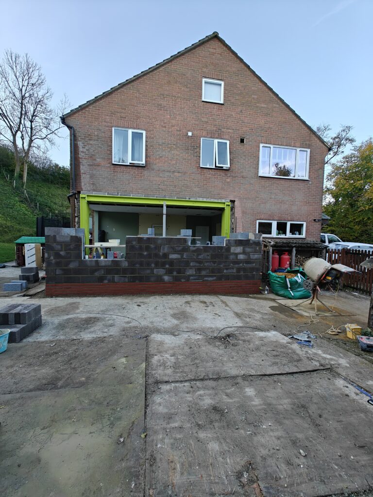 Rear extension, alterations to existing brickwork and installation of steel beam for bifold door. Preparation and laying of porcelain patio.