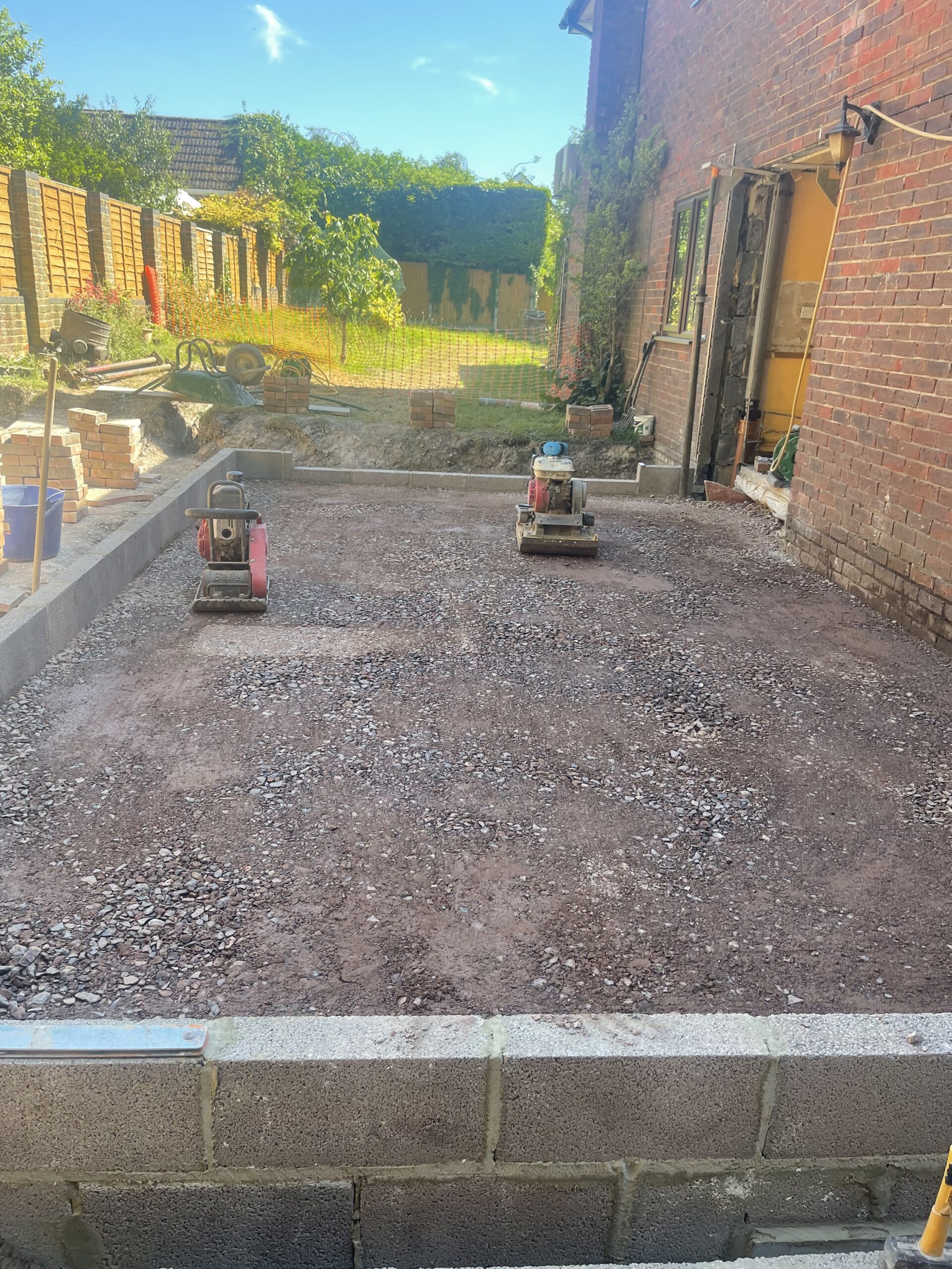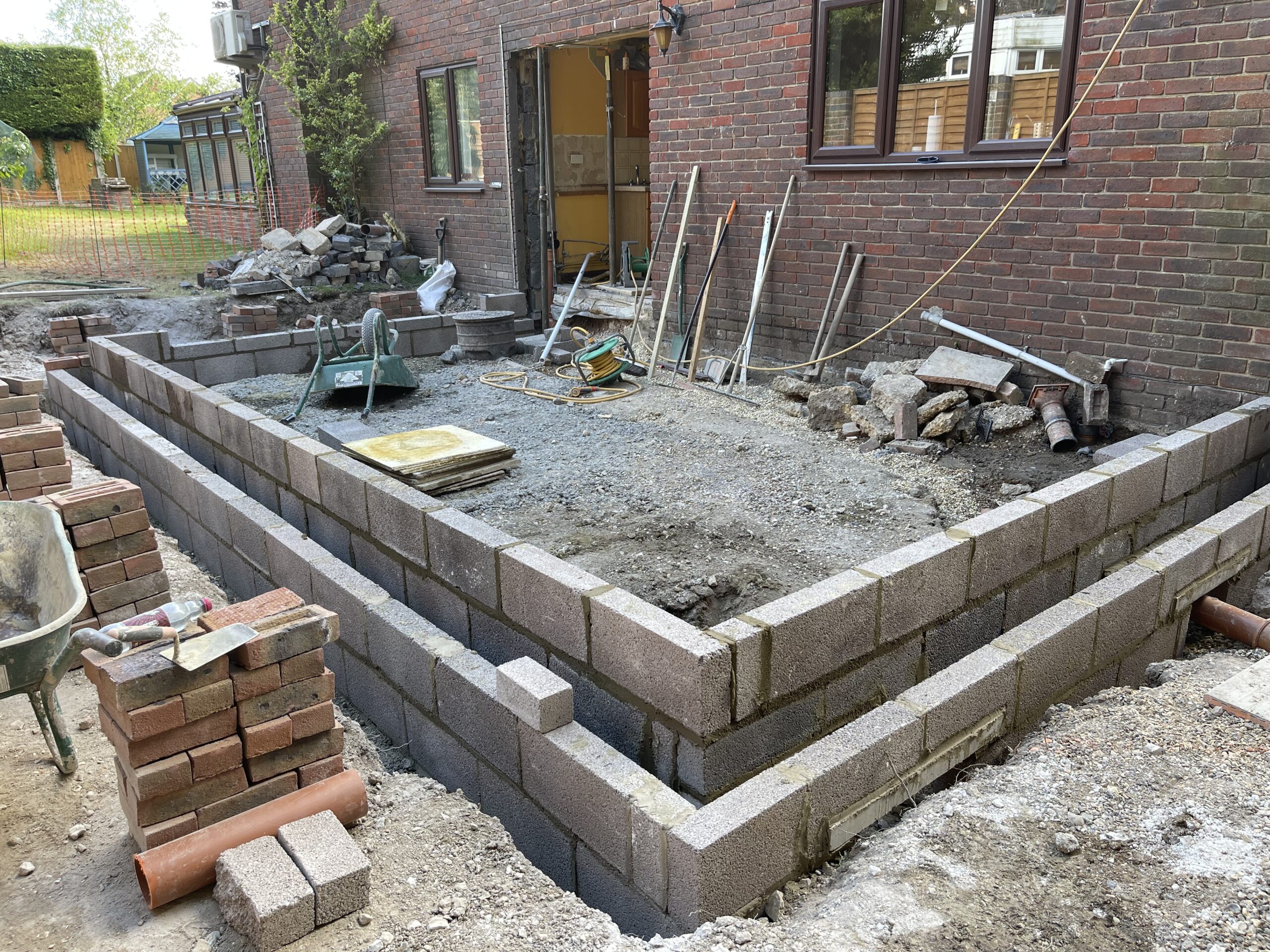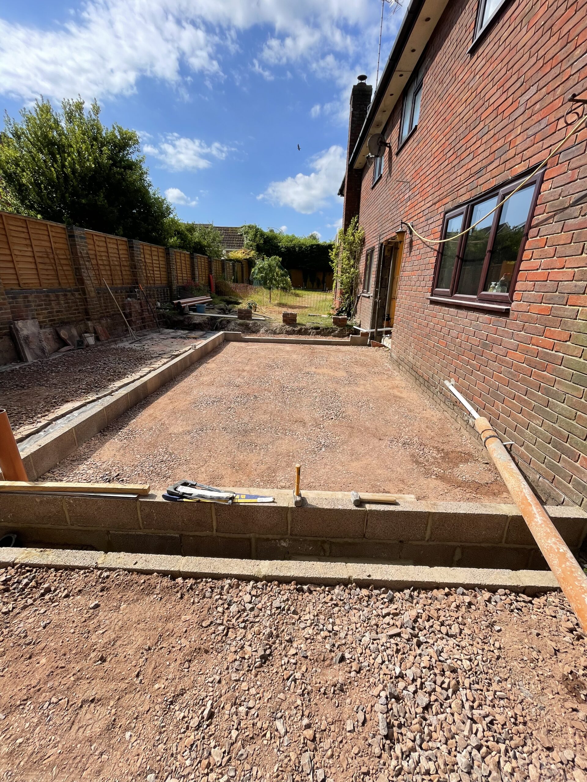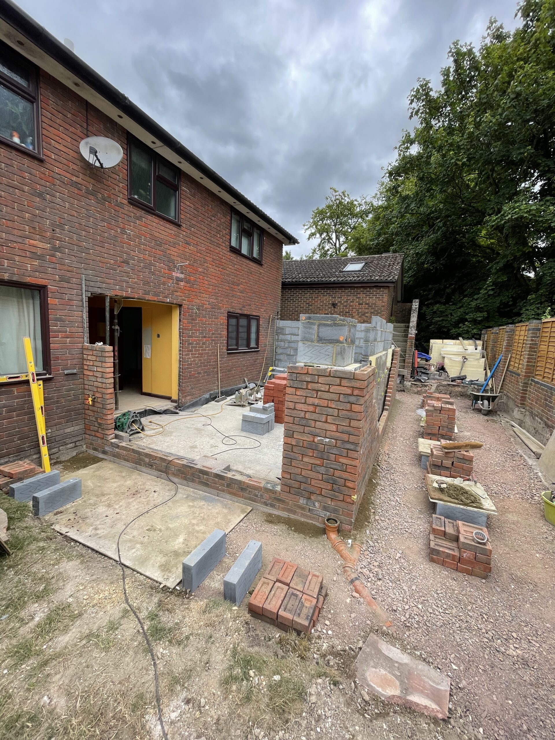 Rear extension, alterations to existing brickwork and installation of steel beam for bifold door. Preparation and laying of porcelain patio.