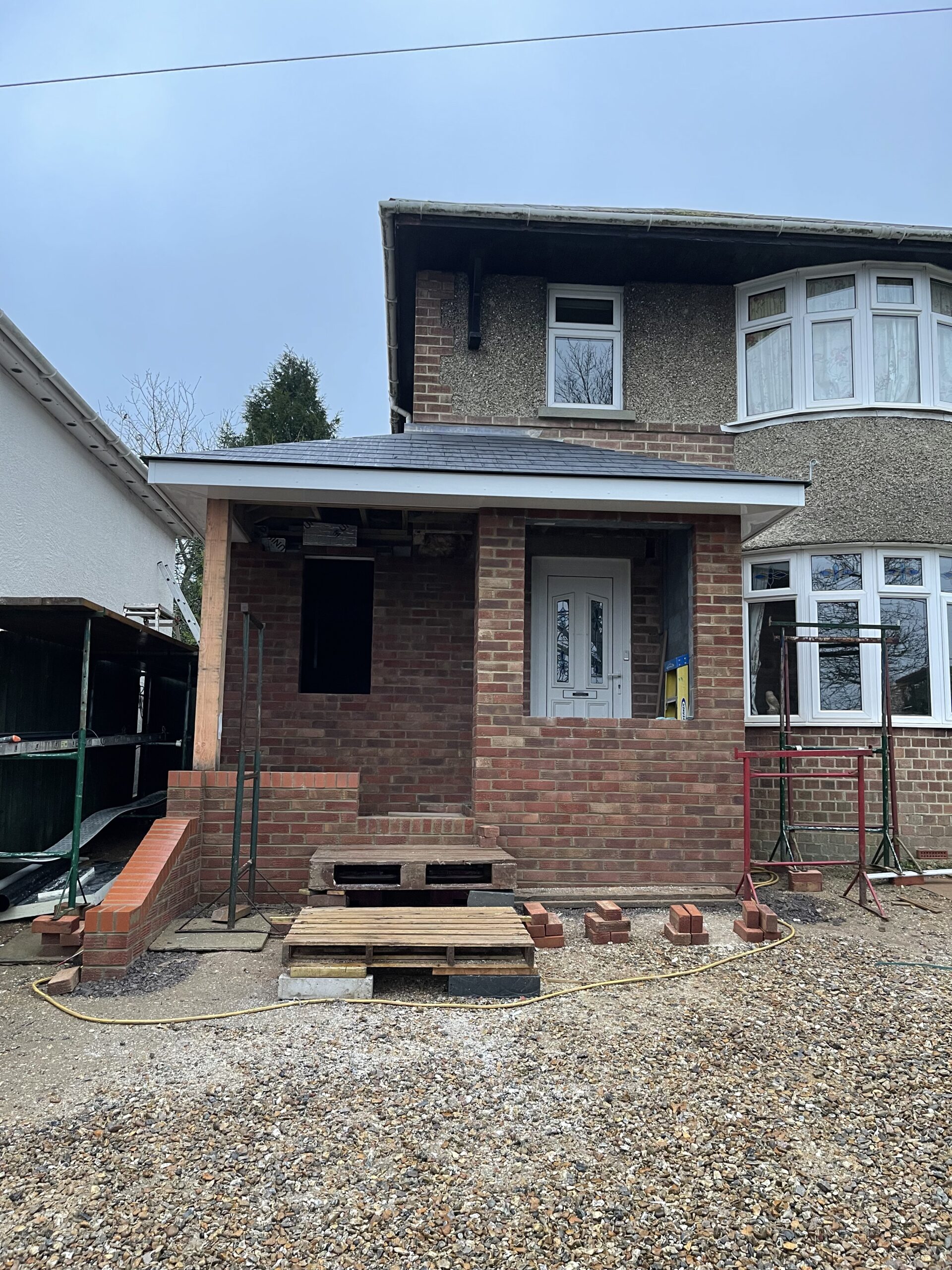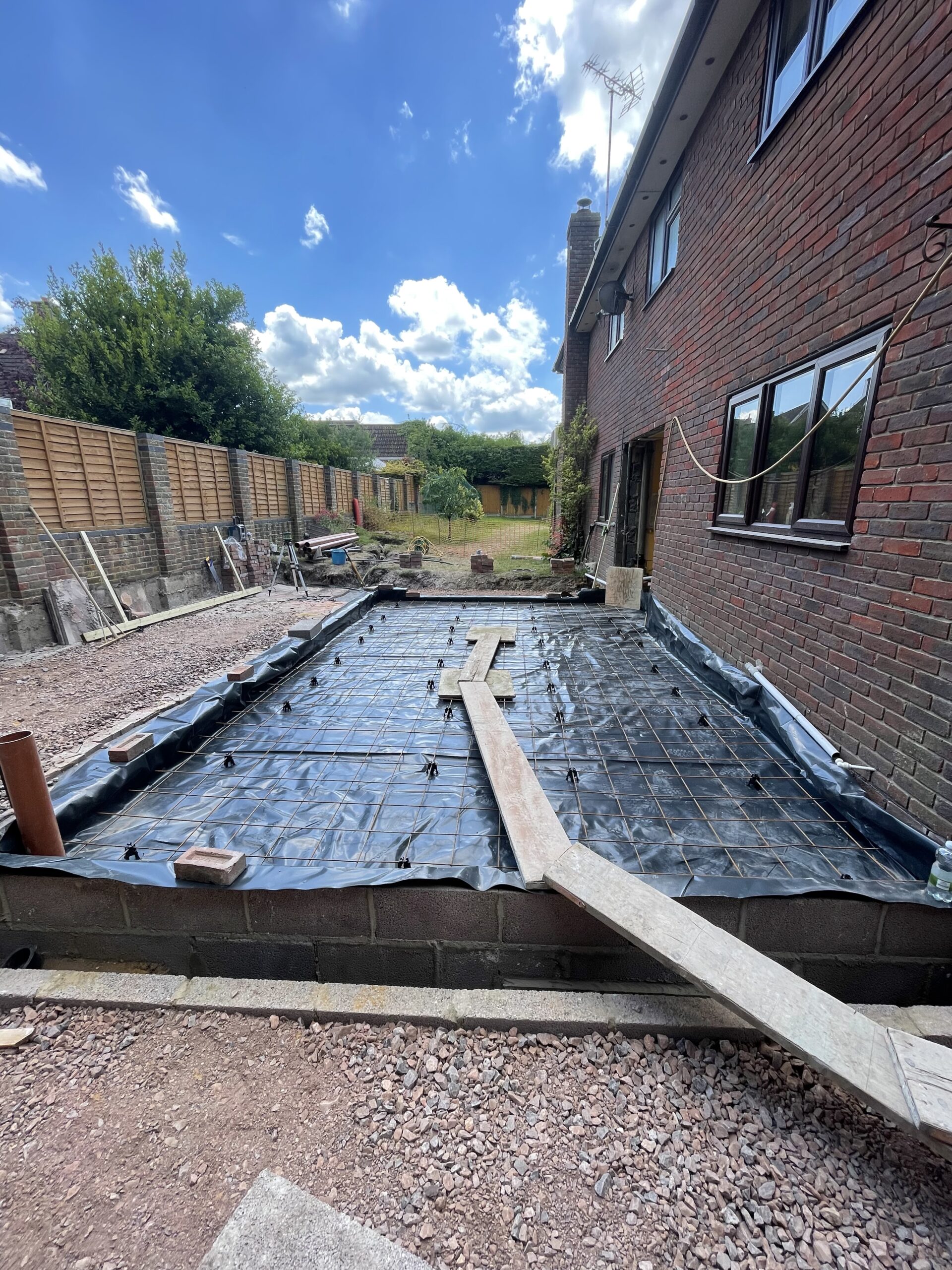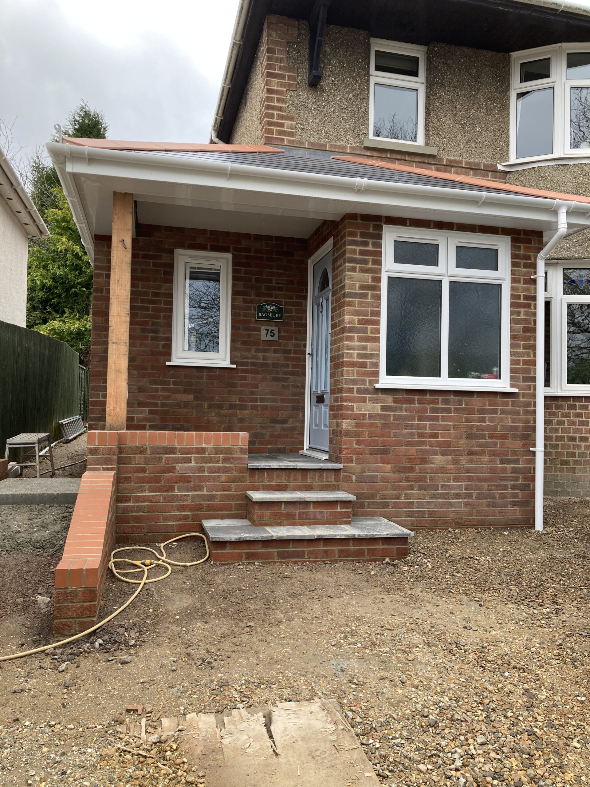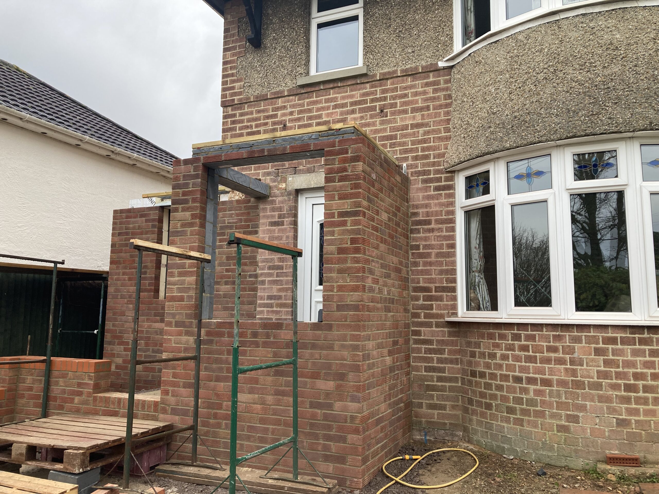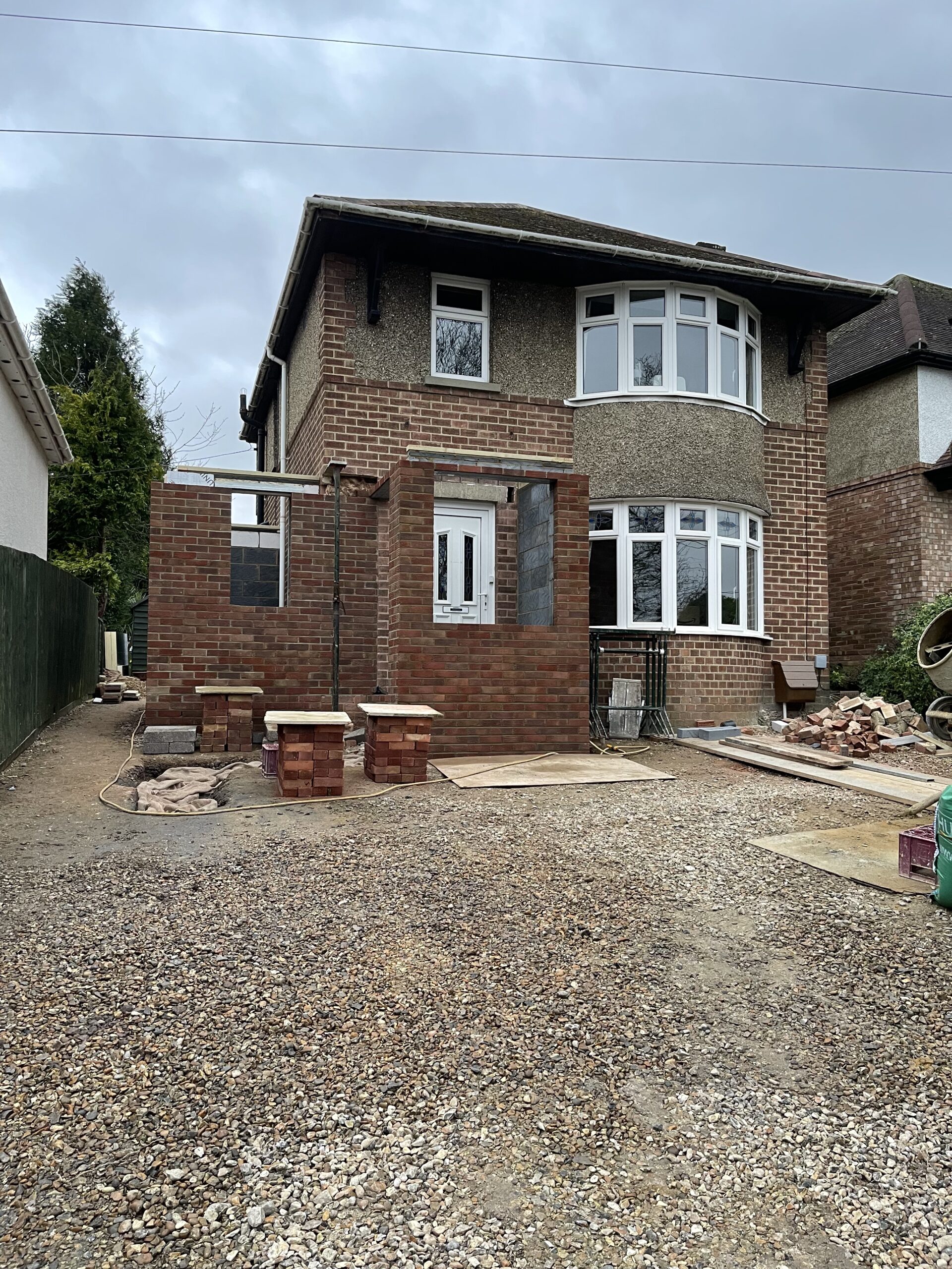 Rear extension, alterations to existing brickwork and installation of steel beam for bifold door. Preparation and laying of porcelain patio.