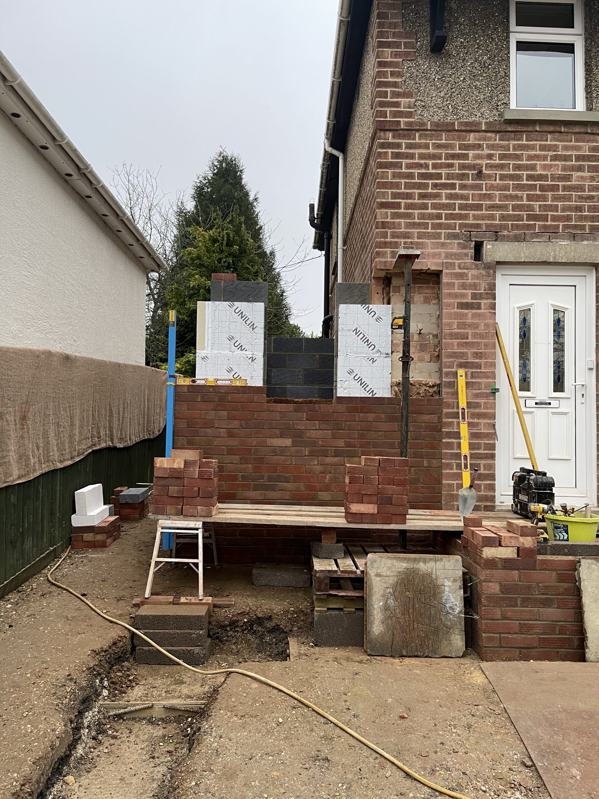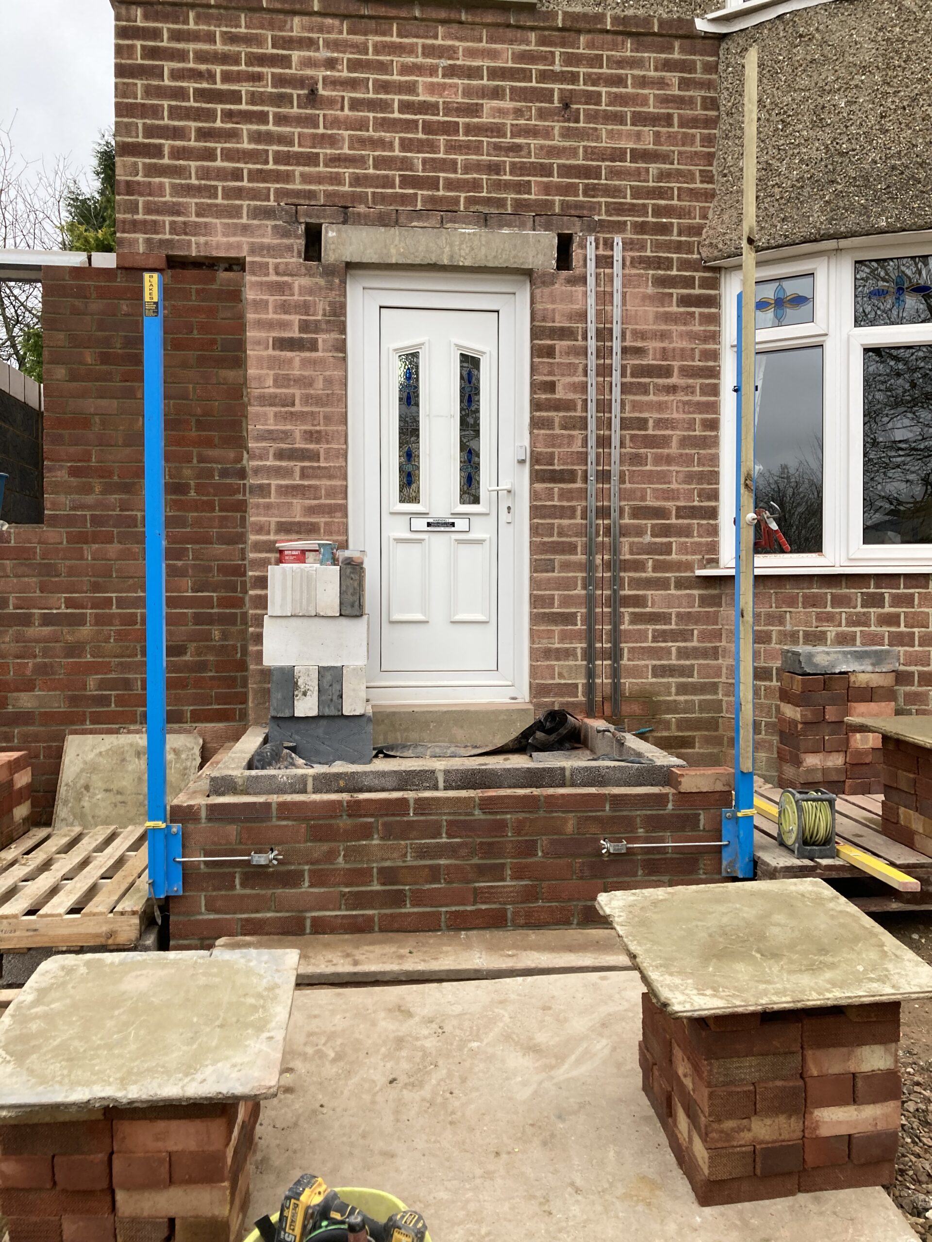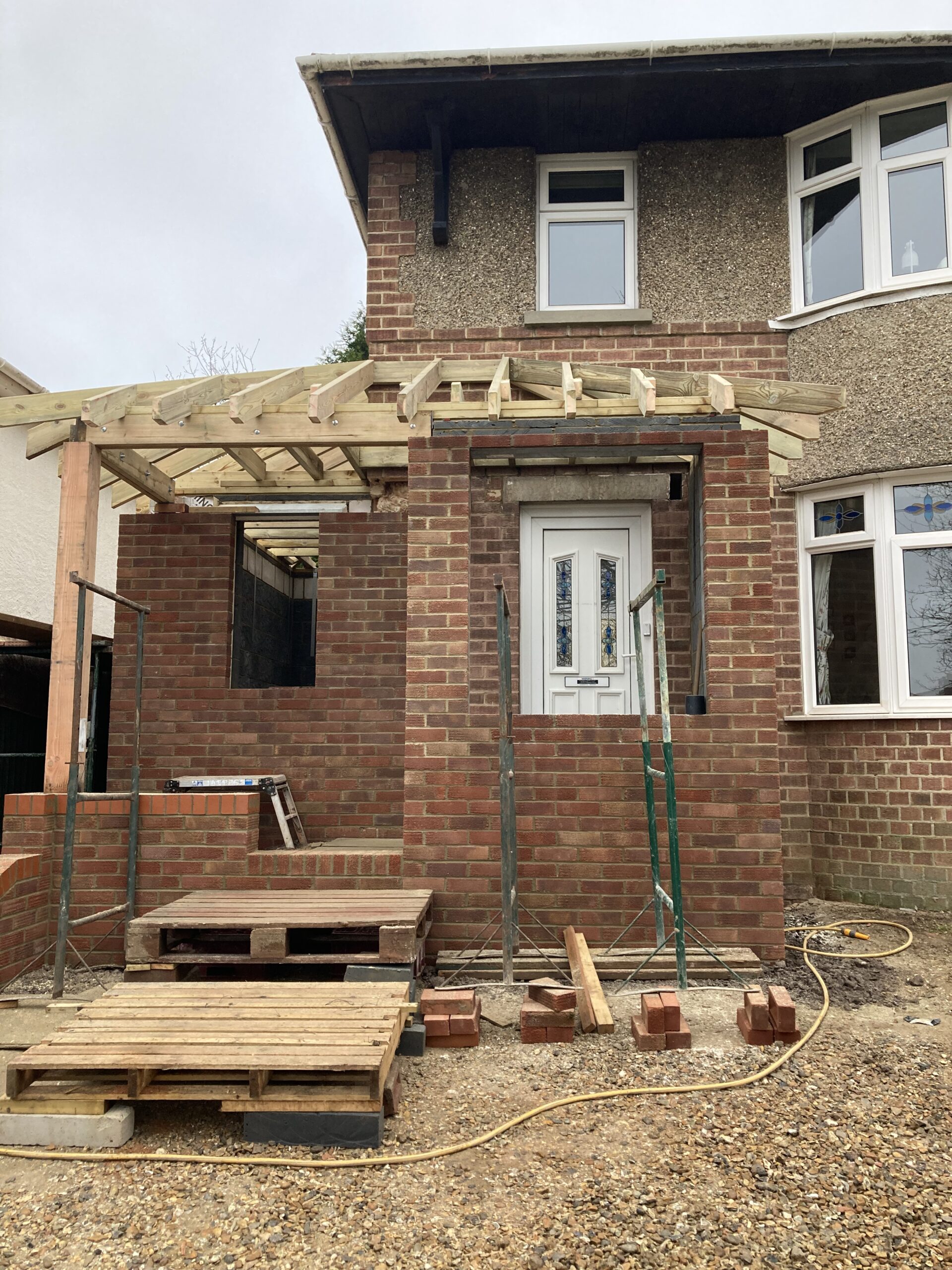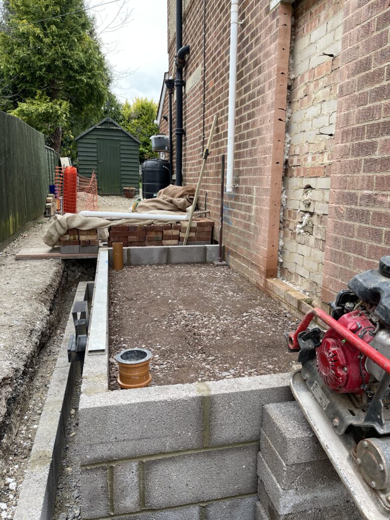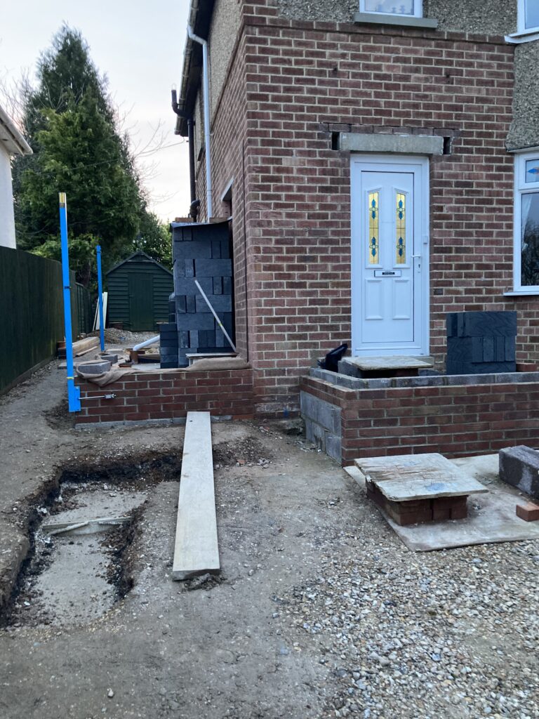 Rear extension, alterations to existing brickwork and installation of steel beam for bifold door. Preparation and laying of porcelain patio.